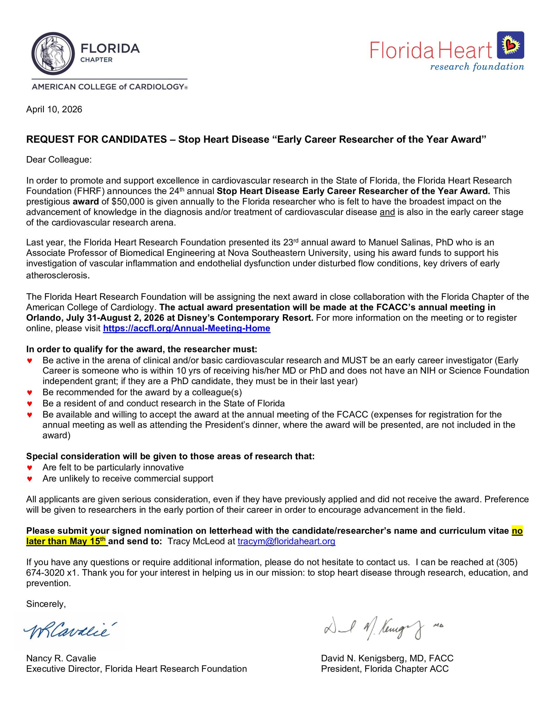 REQUEST FOR CANDIDATES for our 2026 Stop Heart Disease Early Career Researcher of the Year Award